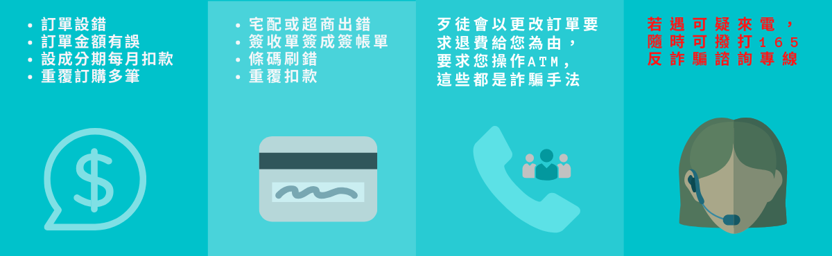 訂單設錯、訂單金額有誤、設成分期每月扣款、重覆訂購多筆、宅配或超商出錯、簽收單簽成簽帳單、條碼刷錯、重覆扣款。歹徒會以更改訂單要求退費給您為由,要求您操作ATM,這些都是詐騙手法。